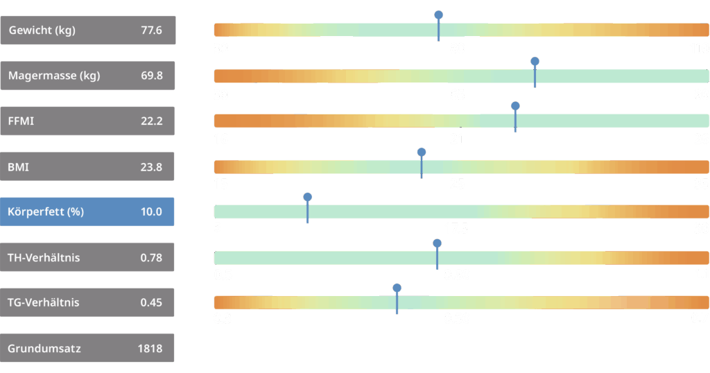• Bestimmung von Gewicht, Körperfettanteil, BMI,